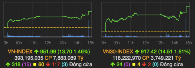 VN-Index đóng cửa tại 952 điểm, tăng gần 14 điểm so với tham chiếu và đánh dấu phiên tăng mạnh nhất trong vòng nửa tháng qua. Số lượng cổ phiếu tăng áp đảo với gần 320 mã, trong khi chỉ có 117 mã chìm trong sắc đỏ.