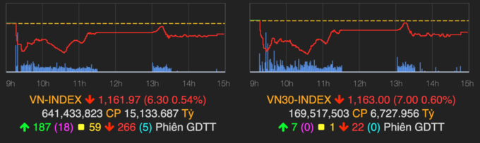 Chốt phiên, VN-Index giảm 0,54% còn 1.161,97 điểm. VN30-Index giảm 0,6% còn 1.163 điểm. Trên sàn Hà Nội, HNX-Index tăng 0,54%, còn UPCOM-Index vượt nhẹ trên tham chiếu.