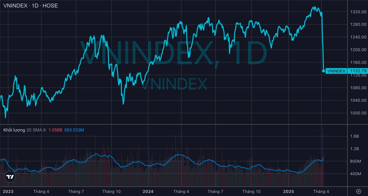 VN-Index kết phiên 8/4 lại mất thêm 77,88 điểm (-6,43%), qua đó rơi xuống mức 1.132,79 điểm, thấp nhất 15 tháng, kể từ đầu tháng 1/2024. Như vậy, chỉ sau 3 phiên, chỉ số chính của chứng khoán Việt Nam đã giảm 185 điểm, vốn hóa theo đó giảm gần 1,1 triệu tỷ đồng, còn khoảng 6,2 triệu tỷ đồng. Chỉ số hợp đồng tương lai VN30 tháng gần nhất (VN30F1M) cũng giảm kịch sàn.
