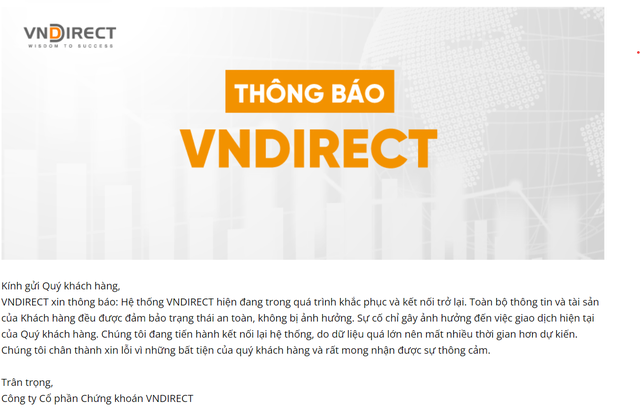 Trước đó, ngay sau khi xảy ra sự cố, Sở Giao dịch Chứng khoán TP HCM (HOSE) và Sở Giao dịch Chứng khoán Hà Nội (HNX) cũng đã ngắt kết nối tạm thời với VNDIRECT.