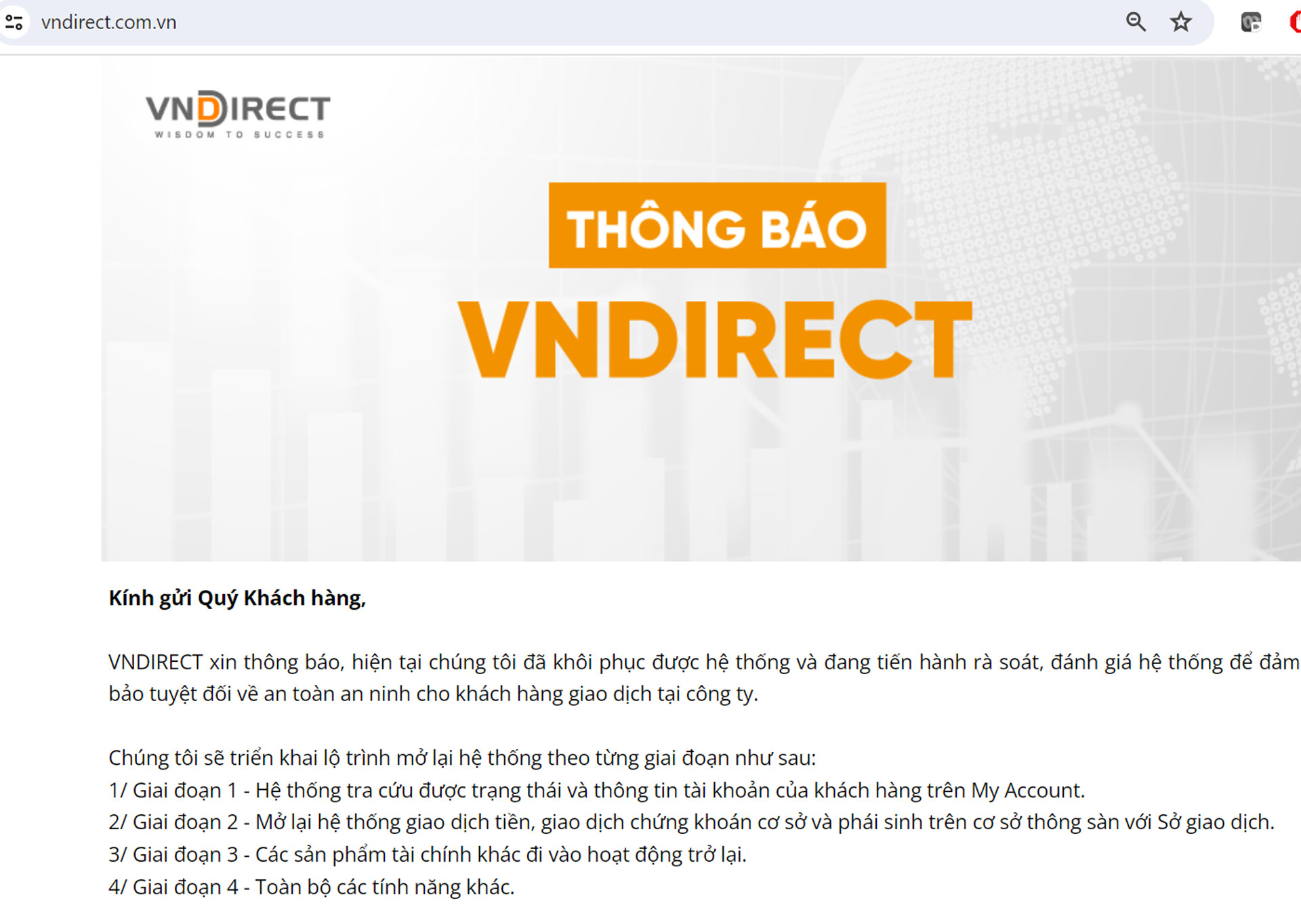 Thông báo mới trên website của đơn vị mình, VNDIRECT cũng thông tin về lộ trình mở lại hệ thống theo 4 giai đoạn, gồm: Giai đoạn 1 - Hệ thống tra cứu được trạng thái và thông tin tài khoản của khách hàng trên My Account; Giai đoạn 2 - Mở lại hệ thống giao dịch tiền, giao dịch chứng khoán cơ sở và phái sinh trên cơ sở thông sàn với Sở giao dịch; Giai đoạn 3 - Các sản phẩm tài chính khác đi vào hoạt động trở lại; Giao đoạn 4 - Toàn bộ các tính năng khác.