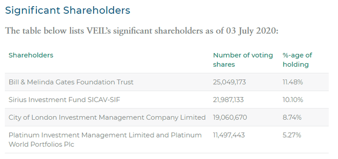 Theo thông tin công bố của VEIL, tại thời điểm ngày 3/7/2020, quỹ Bill & Melinda Gates đang nắm hơn 25 triệu chứng chỉ quỹ, tương đương 11,48%, vẫn là cổ đông lớn nhất của VEIL. Tính theo giá đóng cửa của VEIL vào ngày 21/4/2021, số chứng chỉ quỹ này có giá trị hơn 16 triệu bảng Anh.