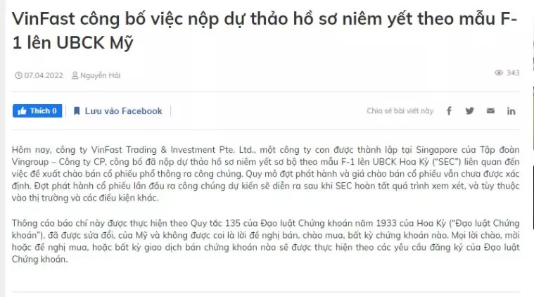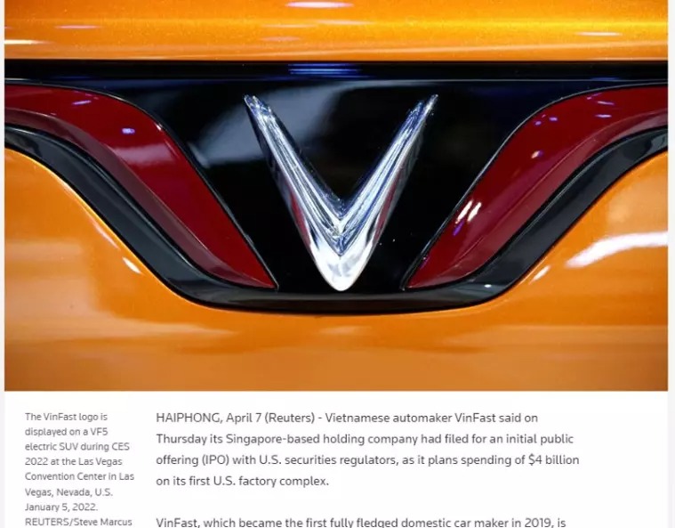 Công ty TNHH Sản xuất và Kinh doanh VinFast (VinFast) cho biết, VinFast Trading & Investment Pte. Ltd. - một công ty con được thành lập tại Singapore của Tập đoàn Vingroup (VinFast Singapore) đã nộp dự thảo hồ sơ niêm yết sơ bộ theo mẫu F-1 lên UBCK Hoa Kỳ (“SEC”) liên quan đến việc đề xuất chào bán cổ phiếu phổ thông ra công chúng.
