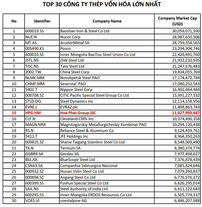 Mới đây, Refinitiv Eikon (tiền thân là Thomson Reuters Data) - hãng dữ liệu của Anh đã công bố Top 30 công ty thép vốn hóa lớn nhất thế giới. Bất ngờ có mặt trong danh sách là Tập đoàn Hòa Phát (mã chứng khoán: HPG). "Ông lớn" ngành thép của Việt Nam đứng vị trí 15 trong danh sách này.
