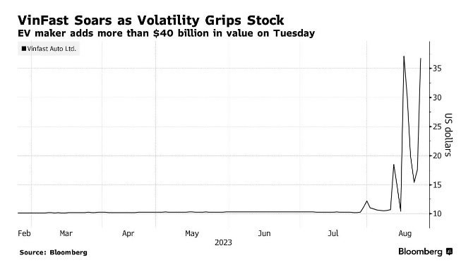Tờ Bloomberg đưa tin, trong phiên giao dịch ngày thứ 3, giá cổ phiếu của Vinfast Auto Ltd. đã tăng vọt tới 109%, bổ sung thêm 44 tỷ USD giá trị thị trường cho nhà sản xuất xe điện của Việt Nam. Điều này kéo dài chuỗi một tuần sôi động với cổ phiếu Vinfast kể từ khi họ IPO vào tuần trước.