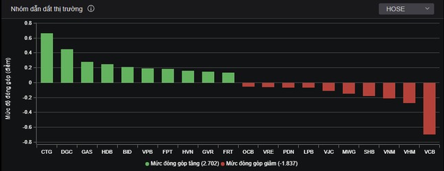 Diễn biến VN-Index chịu sự chi phối từ nhóm VN30. Sắc xanh chiếm ưu thế trong rổ VN30, nhưng mức tăng khiêm tốn, quanh tham chiếu. CTG, HDB tăng mạnh nhất chỉ đạt 1,5%. Trên HoSE, đây cũng là 2 mã ngân hàng có mức tăng cao nhất ngành, dù vậy, tác động đến VN-Index không lớn. Một vài cổ phiếu ngân hàng đã điều chỉnh, TPB, LPB, VCB, OCB, SHB lui về sắc đỏ. VCB trở thành cổ phiếu ảnh hưởng tiêu cực nhất VN-Index trong cả 2 phiên giao dịch gần đây.