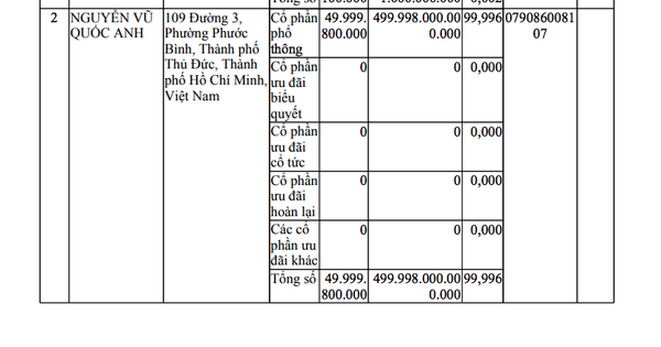 Người đại diện pháp luật của công ty này là ông Nguyễn Vũ Quốc Anh (35 tuổi), thường trú tại TP Thủ Đức, TP HCM. Công ty có 3 cổ đông gồm bà Nguyễn Thị Diễm Hằng ( góp vốn 1 tỉ đồng), ông Nguyễn Vũ Quốc Anh (góp vốn 499.998 tỉ đồng) và ông Lê Hữu Thiện (góp vốn 1 tỉ đồng).