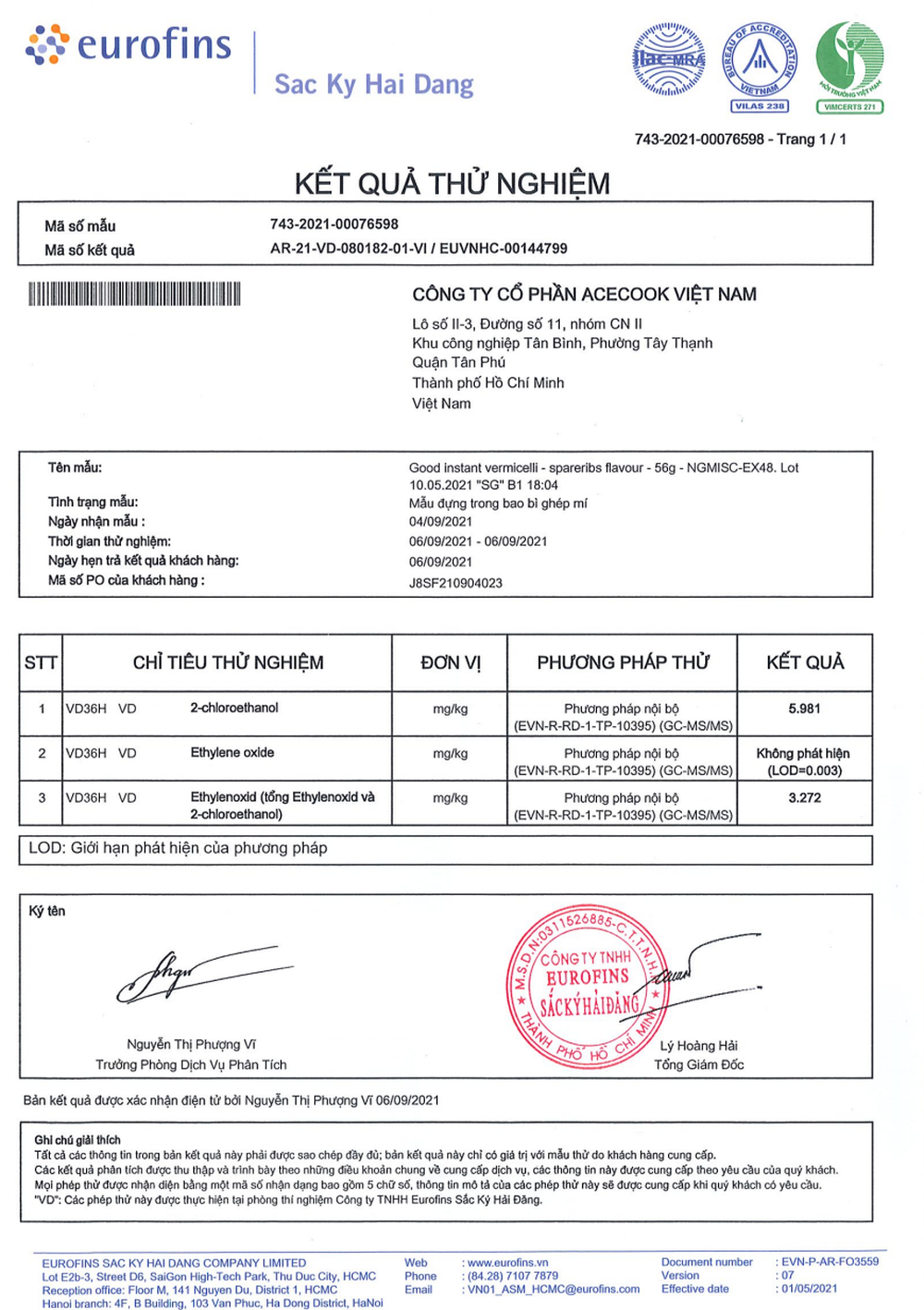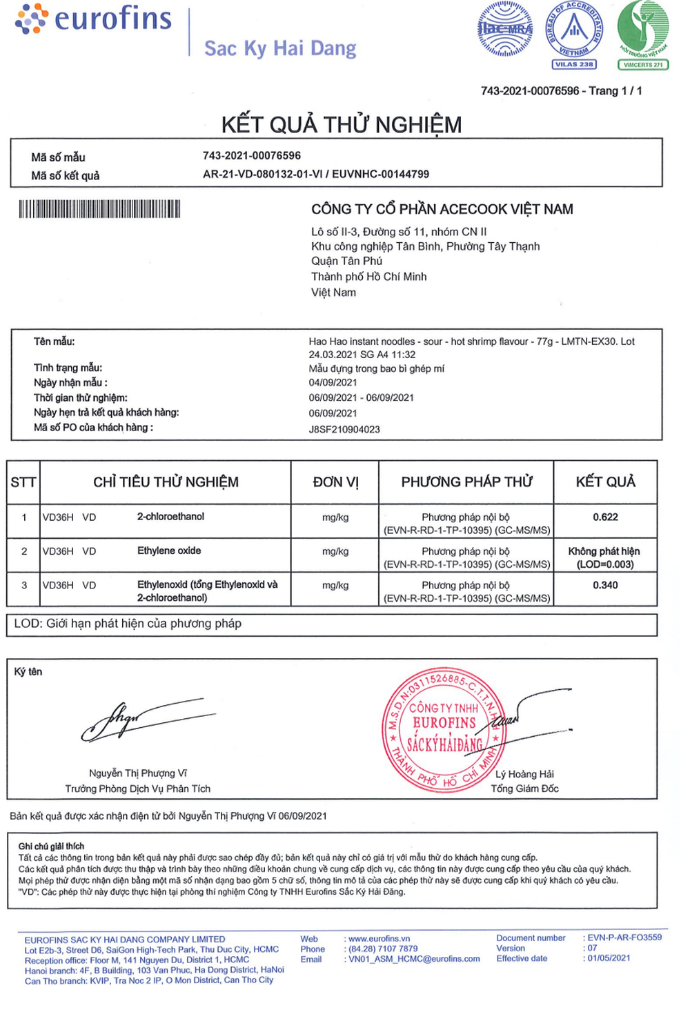 Aecook cho hay, theo kết quả thử nghiệm của Trung tâm phân tích Eurofins thì sản phẩm Hảo Hảo tôm chua cay nội địa không có chất EO và có sự hiện diện của một lượng rất nhỏ 2-chloroetanol (2-CE) với hàm lượng 1,17 ppm.