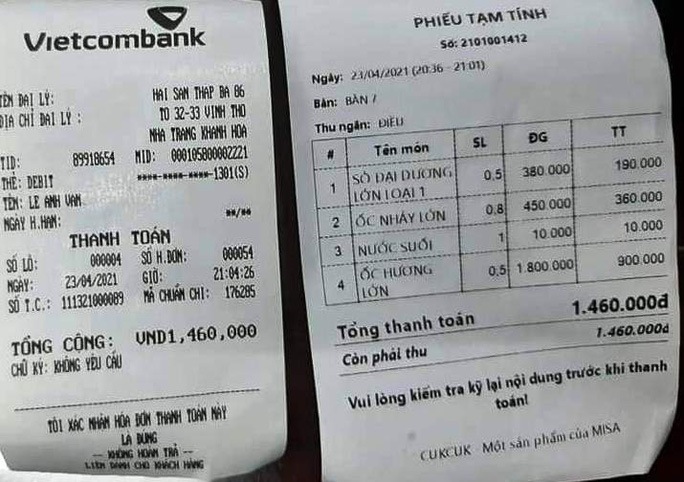 Phiếu tính tiền mà anh V. phản ảnh, gồm các món: sò đại dương lớn loại 1: 0,5 kg: 190.000 đồng; ốc nhảy lớn 0,8 kg: 360.00 đồng; nước suối: 10.000 đồng; ốc hương lớn 0,5 kg: 900.000 đồng (giá 1,8 triệu đồng/kg).
