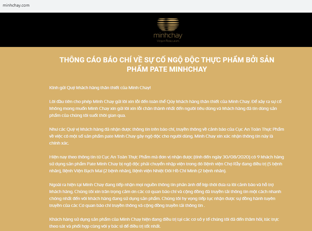 Đặc biệt, sau sự cố Pate Minh Chay chứa độc tố thần kinh cực mạnh bị Bộ Y tế yêu cầu thu hồi sản phẩm, trên 2 website chính thức của doanh nghiệp đã lập tức hiện thông báo thu hồi sản phẩm Pate Minh Chay khi người dùng truy cập. Bên cạnh đó, các danh mục khác trên trang web của nhà hàng này cũng đã không thể truy cập như thực đơn nhà hàng, ẩm thực chay,...