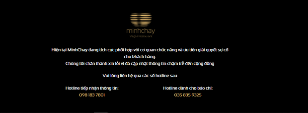 Cuối trang web, Minh Chay cũng gửi lời xin lỗi vì đã cập nhật thông tin chậm trễ, "Hiện tại Minh Chay đang tích cực phối hợp với cơ quan chức năng và ưu tiên giải quyết sự cố cho khách hàng. Chúng tôi chân thành xin lỗi vì đã cập nhật thông tin chậm trễ đến cộng đồng".