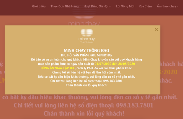 Ngay sau khi bị Bộ Y tế "tuýt còi", trên trang web của nhà hàng cũng đăng tải thông báo thu hồi sản phẩm Pate Minh Chay.