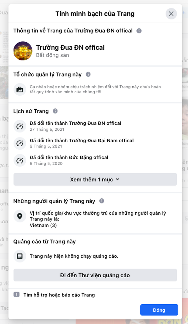 Ngoài ra, trên Facebook đang có một page với tên "Trường Đua ĐN offical", khiến cộng đồng mạng nhầm lẫn. Nhưng khi check thì page này chỉ mới đăng bài viết vào đầu tháng 5/2021 và được đổi tên từ một page "Đức Đặng offical".