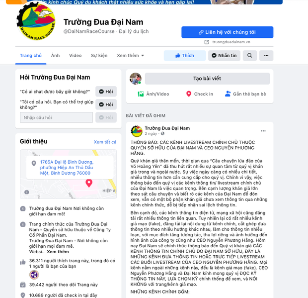 Theo thông tin thì vào ngày 29/5, bà Phương Hằng lại tiếp tục có buổi livestream "bóc" showbiz Việt với khán giả trên Facebook và YouTube. Tuy nhiên, mới đây, netizen phát hiện ra fanpage Trường Đua Đại Nam official đã bỗng nhiên "bốc hơi". Khi nhấn vào link cũ đã được thông báo thì bị báo "Trang này không hiển thị".