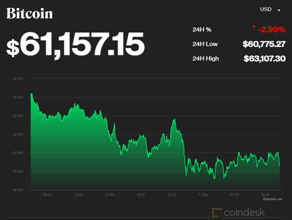 Dữ liệu của CoinDesk lúc 7h23' hôm nay (5/11, giờ Việt Nam) cho thấy, giá Bitcoin được giao dịch ở mức 61.157,15 USD, giảm 2,99% so với ngày hôm qua. Trong 24 giờ qua, giá Bitcoin thời điểm cao nhất đạt 63.100,54 USD, thấp nhất ở mức 60.775,27 USD.
