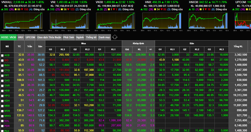 Chốt phiên buổi chiều 21/3, chỉ số VN-Index tăng 23,98 điểm lên 1.493,08 điểm với hàng loạt cổ phiếu bất động sản, bảo hiểm và một số cổ phiếu nhỏ tăng hết biên độ cho phép.