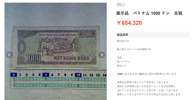 Mới đây, tờ tiền cũ 1.000 đồng Việt Nam, phát hành năm 1988, với số seri NJ 0763081 được rao bán trên trang thương mại điện tử Nhật với giá tới 654.320 yên (gần 140 triệu đồng Việt Nam).