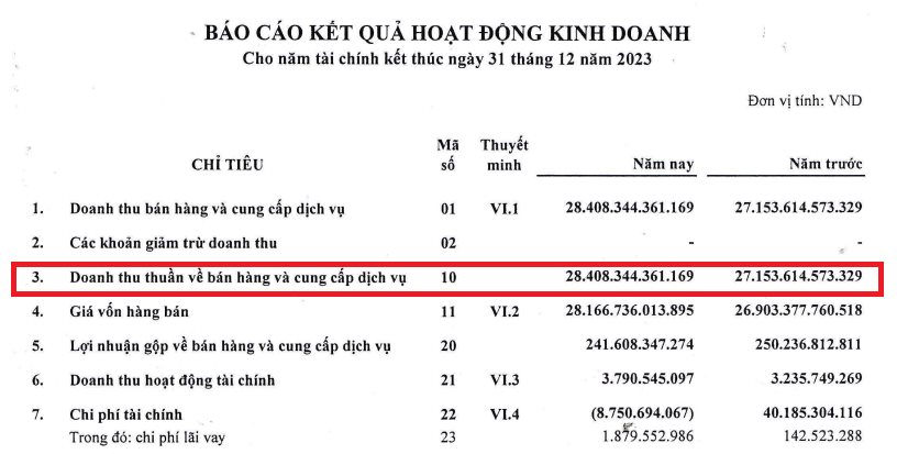 Theo báo cáo tài chính năm 2023 doanh thu thuần của doanh nghiệp vàng này đạt 28.408 tỷ đồng, tăng 4,6% so với năm trước đó. Dù doanh thu tăng nhưng lợi nhuận gộp trong năm của SJC đạt 241,6 tỉ đồng, thấp hơn năm trước hơn 8 tỉ đồng.