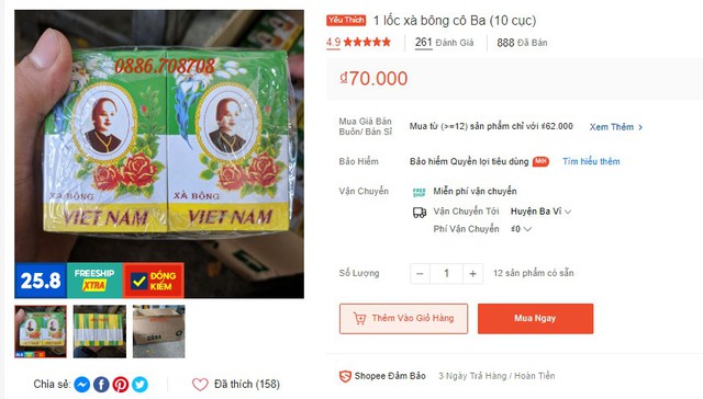 Hiện tại, Xà bông Cô Ba được bán trên một số kênh thương mại điện tử như Shopee với mức giá chỉ 70.000 đồng/1 lốc 10 hộp. Mua từ trên 12 sản phẩm chỉ có giá 62.000 đồng.