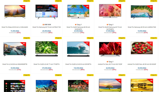 Đặc biệt, Smart Tivi Sharp 4K 70 inch LC-70UD1X giảm mạnh 80% từ 125 triệu xuống còn 24,99 triệu, Smart Tivi Samsung 4K 65 inch UA65NU8500 giảm 70% còn 15,99 triệu đồng, Smart Tivi QLED Samsung 4K 75 inch QA75Q9FAM có giá niêm yết là 199 triệu đồng nay giảm 82% chỉ còn 34,9 triệu đồng,