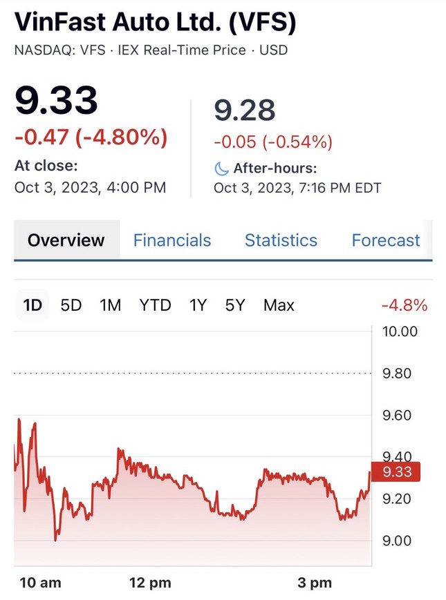 Chốt phiên, thị giá VFS đứng ở mức 9,33 USD/cổ phiếu, giảm 4,8% so với phiên liền trước và là mức thấp nhất kể từ khi lên sàn Nasdaq của Mỹ hôm 15/8.