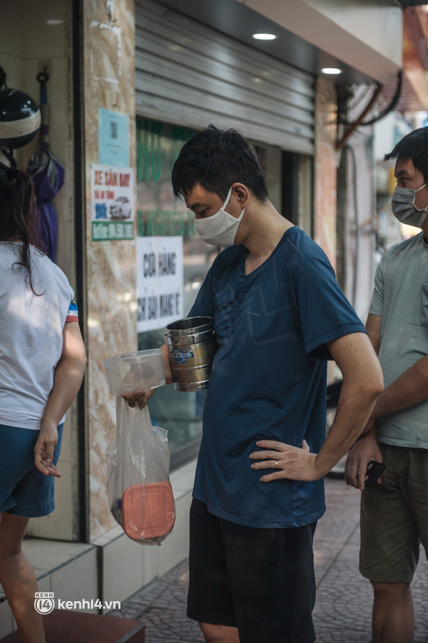 Sáng nay, không khí háo hức vẫn xôn xao ở khắp quận Long Biên khi người dân xếp hàng chờ mua đồ ăn. Nhiều người mang sẵn cả hộp, khay đựng của gia đình đi mua, thậm chí có người ôm hẳn theo một chiếc nồi to. Có vẻ như việc được mua đồ ăn hàng là một niềm vui vô cùng lớn của rất nhiều người dân ở đây.