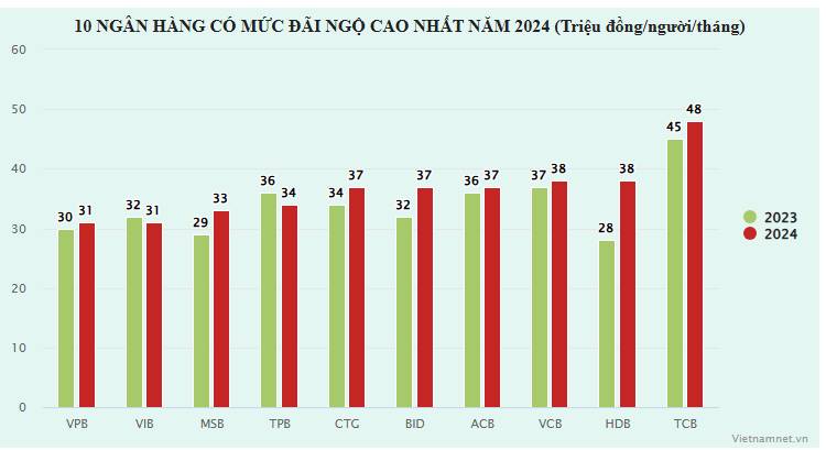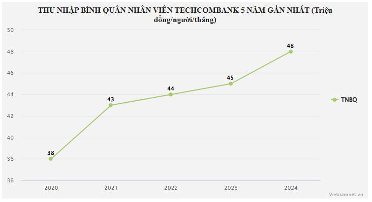 Đáng lưu ý, Techcombank tiếp tục xô đổ kỷ lục của chính mình về mức đãi ngộ cho người lao động khi thu nhập bình quân mỗi tháng của nhân viên ngân hàng này đạt cột mốc mới: 48 triệu đồng/người/tháng trong năm 2024, tăng 3 triệu đồng so với mức thu nhập bình quân đầu người của năm 2023.