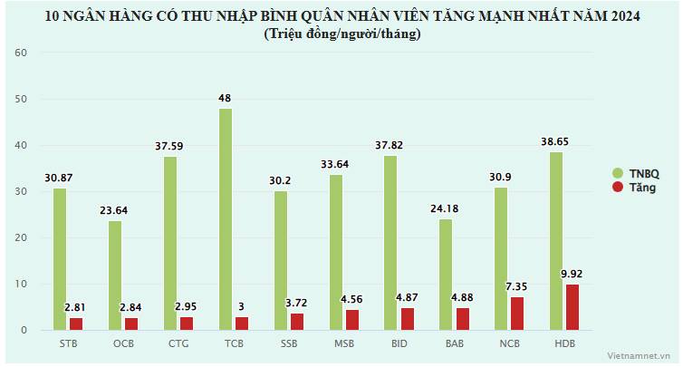 Dù đứng thứ hai sau Techcombank, nhưng HDBank lại đứng đầu hệ thống về mức tăng thu nhập cho nhân viên. Thu nhập bình quân của nhân viên HDBank tăng thêm tới 9,9 triệu đồng so với năm 2023. Con số này khiến HDBank gây bất ngờ khi vượt qua nhóm các “ông lớn” như BIDV, Vietcombank, VietinBank.