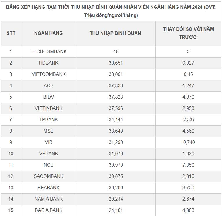 Ba ngân hàng đứng sau là ACB, BIDV và VietinBank có mức thu nhập bình quân nhân viên từ 37,59-37,83 triệu đồng/người/tháng.