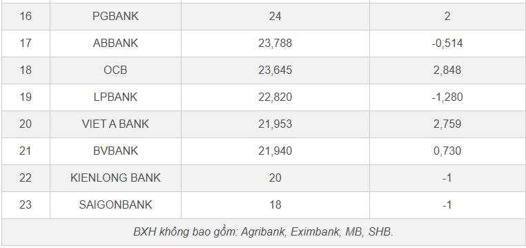 Nhân viên hai ngân hàng Saigonbank và KienlongBank có thu nhập bình quân thấp nhất, lần lượt là 18 triệu đồng và 20 triệu đồng/người/tháng, cùng giảm 1 triệu đồng/tháng so với năm trước.