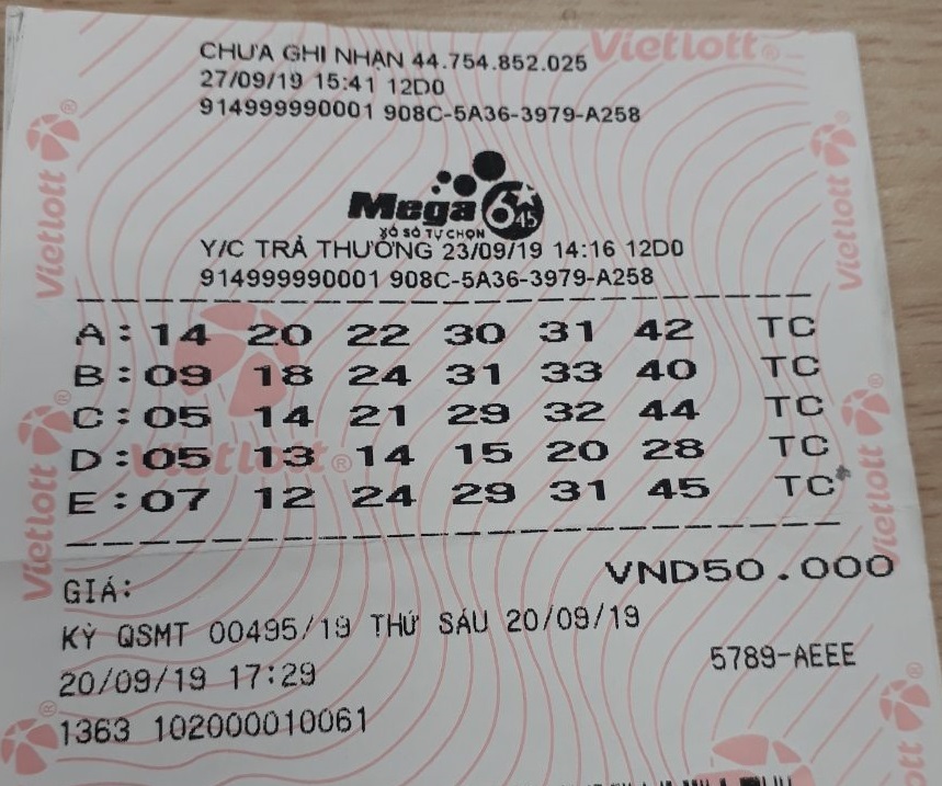 Trước đó, Chi nhánh Cần Thơ đã tiếp nhận chiếc vé xổ số tự chọn Mega 6/45 từ chị Đ.T.T. Qua kiểm tra trên hệ thống kỹ thuật và hồ sơ kèm theo, Vietlott xác định đây là 1 trong 2 chiếc vé đã trúng giải Jackpot sản phẩm Mega 6/45 kỳ QSMT thứ 495 ngày 20/9/2019 với giá trị là 49.726.502.250 đồng (chưa khấu trừ thuế thu nhập cá nhân theo quy định).