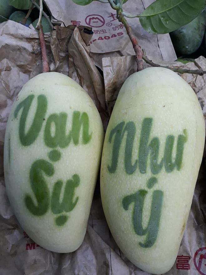 Cụ thể, giá của xoài thư pháp chữ đỏ ở mức 350 – 400.000 đồng/quả, xoài chữ xanh vỏ vàng 200.000 – 250.000 đồng/quả, xoài vỏ xanh chữ vàng 170.000 – 200.000 đồng/quả và đặc biệt, không chỉ có xoài, đu đủ thư pháp tài lộc cũng được rao bán với giá 200.000 – 270.000 đồng/quả.