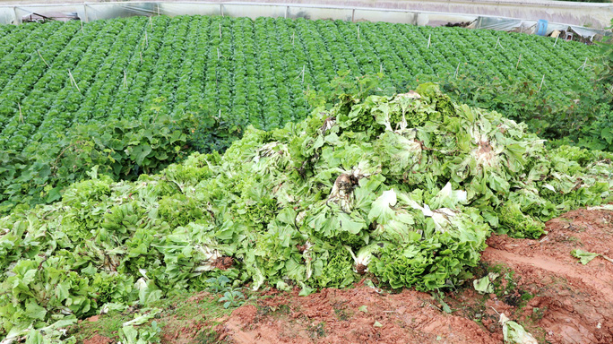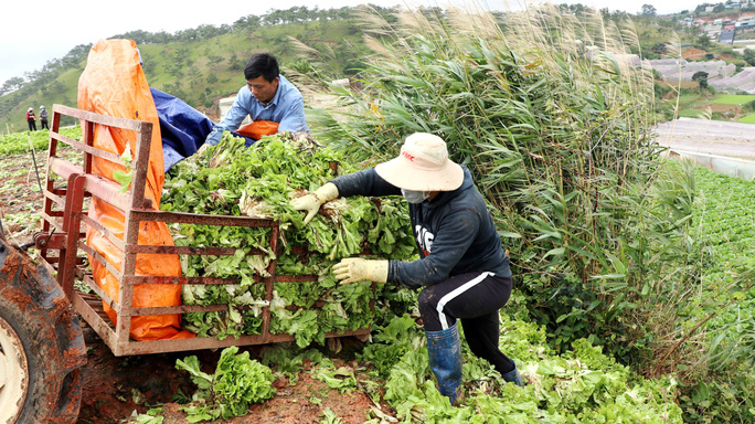 Theo ghi nhận, cánh đồng trồng rau xà lách caron của bà Nguyễn Thị Thanh Ngà (phường 8, TP.Đà Lạt) phải thuê người nhổ bỏ hàng chục tấn rau rồi cho máy cày chở đổ bỏ.