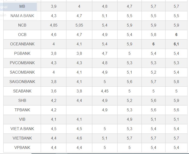 OceanBank là ngân hàng dẫn đầu ở cả hai kỳ hạn này, lần lượt 6-6,1%/năm. OCB cũng có lãi suất huy động kỳ hạn 36 tháng lên đến 6%/năm.