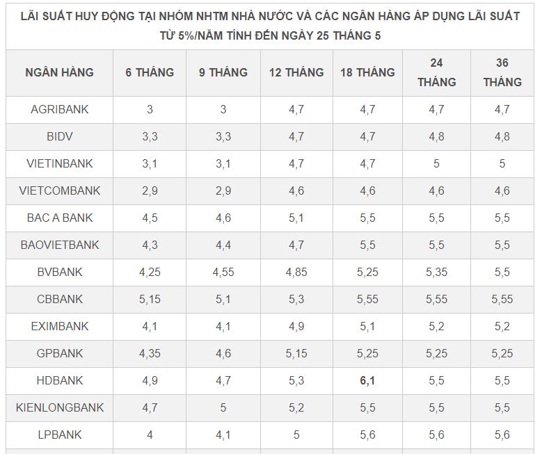 Hiện có 13 ngân hàng thương mại duy trì mức lãi suất từ 5%/năm cho tiền gửi kỳ hạn 12 tháng. Trong đó, NCB và OceanBank dẫn đầu (5,4%/năm); CB, HDBank (5,3%/năm); KienLong Bank (5,2%/năm); GPBank (5,15%/năm); Bac A Bank, Nam A Bank, và VietBank (5,1%/năm);...