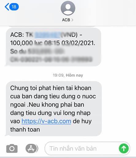 Theo phản ánh của nhiều khách hàng ACB, trong vài ngày gần đây nhận được tin nhắn có nội dung như: "Chung toi phat hien tai khoan cua ban dang tieu dung o nuoc ngoai. Neu khong phai ban dang tieu dung vui long nhap vao http://v-acb.com đe huy thanh toan",