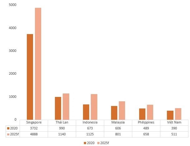 Báo cáo tài sản mới nhất của Knight Frank ước tính tốc độ tăng triệu phú của Việt Nam giai đoạn 2020-2025 là 32%, trong khi tốc độ tăng người siêu giàu với tổng tài sản trên 30 triệu USD là 31%.
