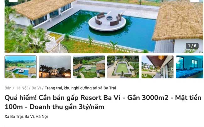 Mới đây, anh L.A rao bán khu resort 3ha tại thị xã Sơn Tây. Theo giới thiệu, đây là khu du lịch sinh thái nghỉ dưỡng, khách sạn nhà hàng team building, được trang bị đầy đủ các tiện ích hiện đại. Trước đó, chủ đầu tư dự án này đã chi tới hơn 100 tỷ đồng. Hiện tại, chủ đầu tư dự án sang tên lại cho đối tác có nhu cầu với toàn bộ tài sản, bộ máy nhân viên đang hoạt động với mức giá bán 85 tỷ đồng.