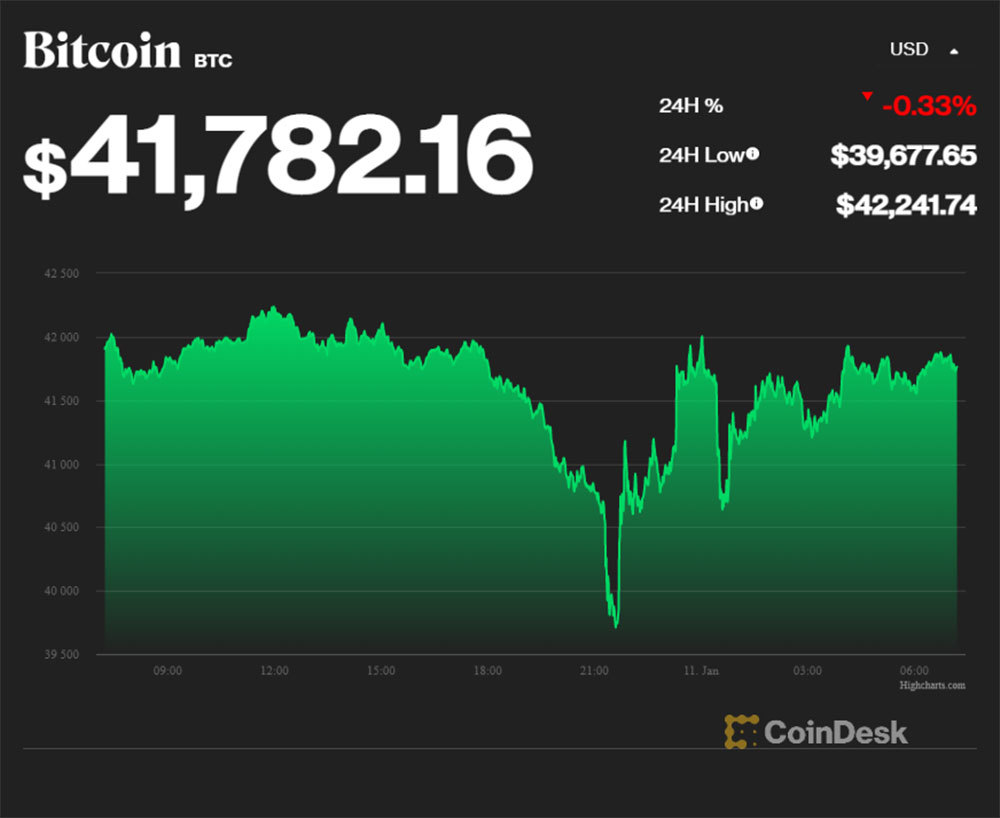 Tới 7h' sáng nay (11/1, theo giờ Việt Nam), theo dữ liệu cập nhật từ CoinDesk, giá Bitcoin được giao dịch ở mức 41.782,16 USD, giảm 0,33% so với ngày hôm qua. Trong 24 giờ gần nhất, giá Bitcoin thời điểm cao nhất đạt 42.241,74 USD, nhưng có thời điểm đã lao xuống mốc thấp nhất là 39.677,65 USD. Đây là mức giá thấp nhất của Bitcoin trong vòng 3 tháng qua.