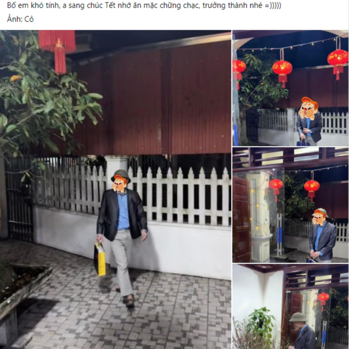Chàng trai mặc áo sơ mi cùng quần kaki, khoác áo vest màu ghi kiểu trung niên. Điểm nhấn ấn tượng là chiếc mũ cối “huyền thoại”. Anh chàng tay xách túi quà tiến vào nhà bạn gái rất tự tin, cúi chào phụ huynh. Nhiều người không thể nhịn cười bình luận: “Rồi ai trông giống phụ huynh hơn?”.