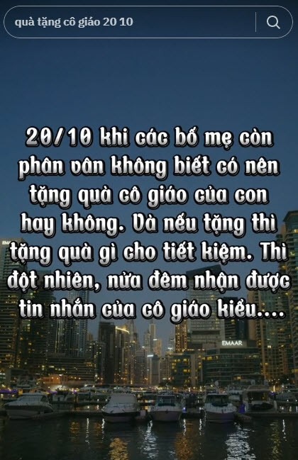 Mới đây trên một tài khoản mạng xã hội có tên giadinhriroi đăng tải câu hỏi tương tự nhân ngày Phụ nữ Việt Nam 20/10. Tuy nhiên nội dung sau đó đã khiến không ít bậc cha mẹ phải bất ngờ. Bà mẹ cho hay "20/10 khi các bố mẹ còn phân vân không biết có nên tặng quà cô giáo của con hay không và nếu tặng thì tặng quà gì cho tiết kiệm thì đột nhiên, nửa đêm nhận được tin nhắn của cô giáo kiểu...". Ai nấy đều tò mò, liệu cô giáo đã nhắn gì.