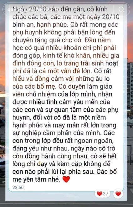 Hóa ra nguyên văn nội dung tin nhắn là "Ngày 20/10 sắp đến gần, cô kính chúc các bà, các mẹ một ngày 20/10 bình an, hạnh phúc. Cô rất mong các phụ huynh không phải bận lòng đến chuyện tặng quà cho cô. Đầu năm học có quá nhiều khoản chi phí phải đóng góp, kinh tế khó khăn, nhiều gia đình đông con, lo trang trải sinh hoạt phí đã là cả một vấn đề lớn. Cô rất hiểu và đồng cảm với những âu lo của các bố mẹ.