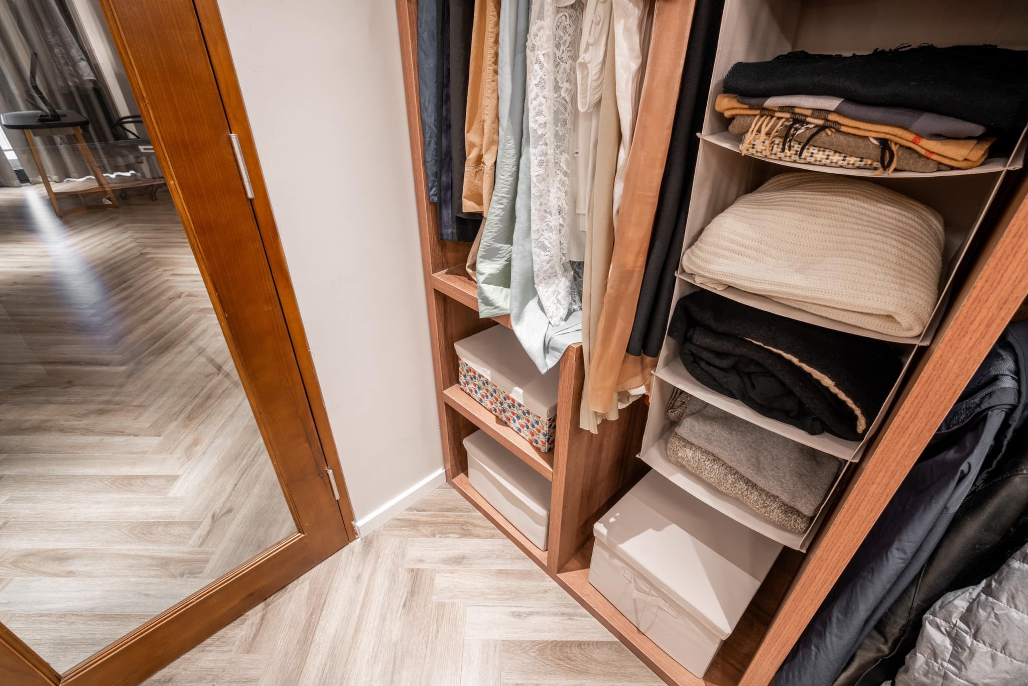 Các khu vực treo và gấp trong tủ có thể được phân loại và đặt theo các loại quần áo khác nhau. Ví dụ, bạn có thể phân chia thành khu vực áo len, khu vực áo thun dài tay, khu vực áo khoác, váy,…