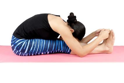 Ngồi thẳng lưng trên sàn, hai chân duỗi thẳng trước mặt, áp gót chân xuống sàn và hướng ngón chân thẳng lên trần. Hai tay giơ qua đầu, áp tai rồi từ từ đưa tay nắm ngón cái hai chân. Cúi người về phía trước sao cho bụng chạm đùi, đầu trán chạm chân.