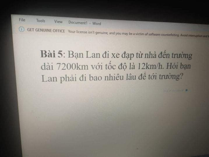 Mới đây, mạng xã hội xuất hiện một bài toán tiểu học "gây lú" cực mạnh. Cụ thể bài toán như sau: "Bạn Lan đi xe đạp từ nhà đến trường dài 7.200km với tốc độ là 12km/h. Hỏi bạn Lan phải đi bao nhiêu lâu để tới trường?".