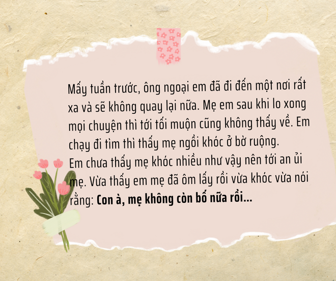 Mấy tuần trước, ông ngoại em đã đi đến một nơi rất xa và sẽ không quay lại nữa. Mẹ em sau khi lo xong mọi chuyện thì tới tối muộn cũng không thấy về. Em chạy đi tìm thì thấy mẹ ngồi khóc ở bờ ruộng. Từ bé tới giờ em chưa thấy mẹ khóc như vậy nên tới an ủi mẹ. Vừa thấy em mẹ đã ôm lấy rồi vừa khóc nức nở vừa nói rằng: ‘Con à, mẹ không còn bố nữa rồi…’