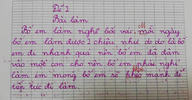 Cụ thể, em học sinh này kể như sau: "Bố em làm nghề bốc vác. Mỗi ngày bố em làm được 2 triệu, nhưng do là bố em đi nhanh quá, nên bố em đã đâm vào một con chó nên bố em phải nghỉ làm. Em mong rằng bố em sẽ khỏe mạnh để tiếp tục đi làm".