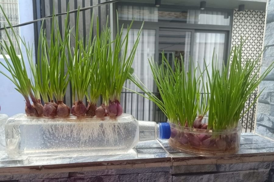 Sau đó, đặt củ hành xuống chậu đất, sao cho đất sâu 1/2 củ. Tưới nước cho cây 2 lần/ngày. Sau khoảng 2 tuần là bạn đã có ngay hành lá để ăn, cứ cắt lại lên, ăn cả năm không hết.