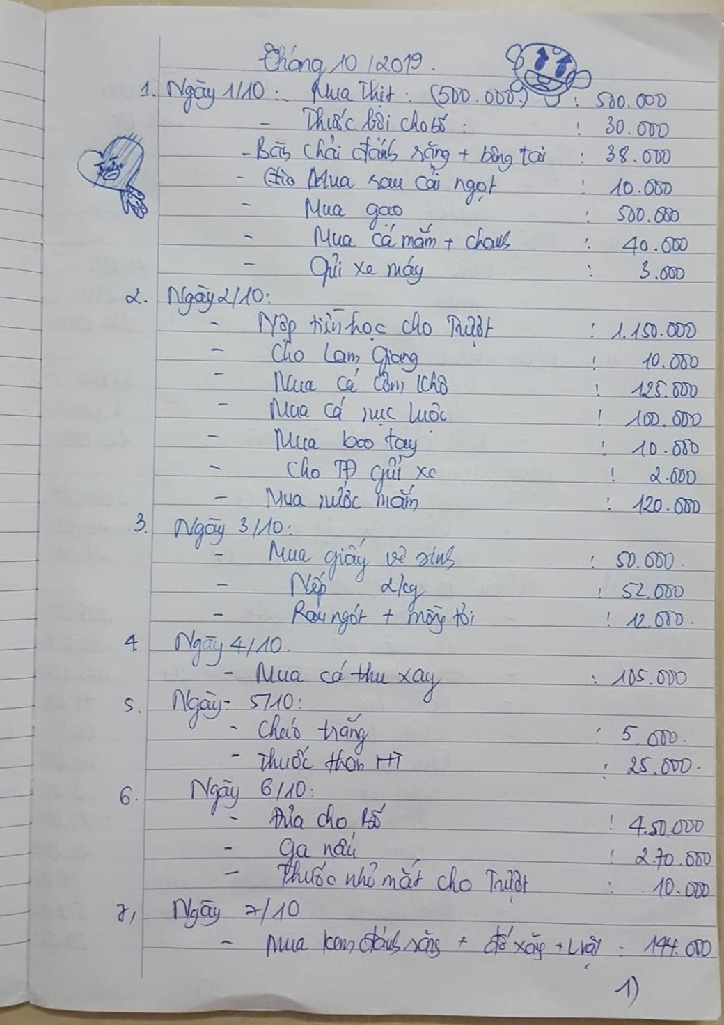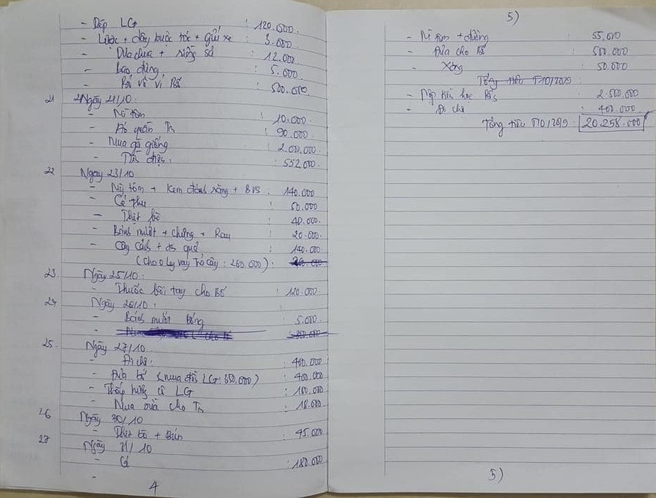 Bảng chi tiêu dài hơn 4 trang của một bà vợ đang được các chị em lan truyền khắp các diễn đàn, hội nhóm. Được biết, bảng chi tiêu này được chị vợ ghi lại rất cụ thể từng món đồ dùng, thực phẩm được mua trong từng ngày của tháng 10 năm nay. Tổng chi tiêu là hơn 20 triệu đồng, trong đó nhiều khoản chi tiêu khá tiết kiệm, không hề hoang phí.