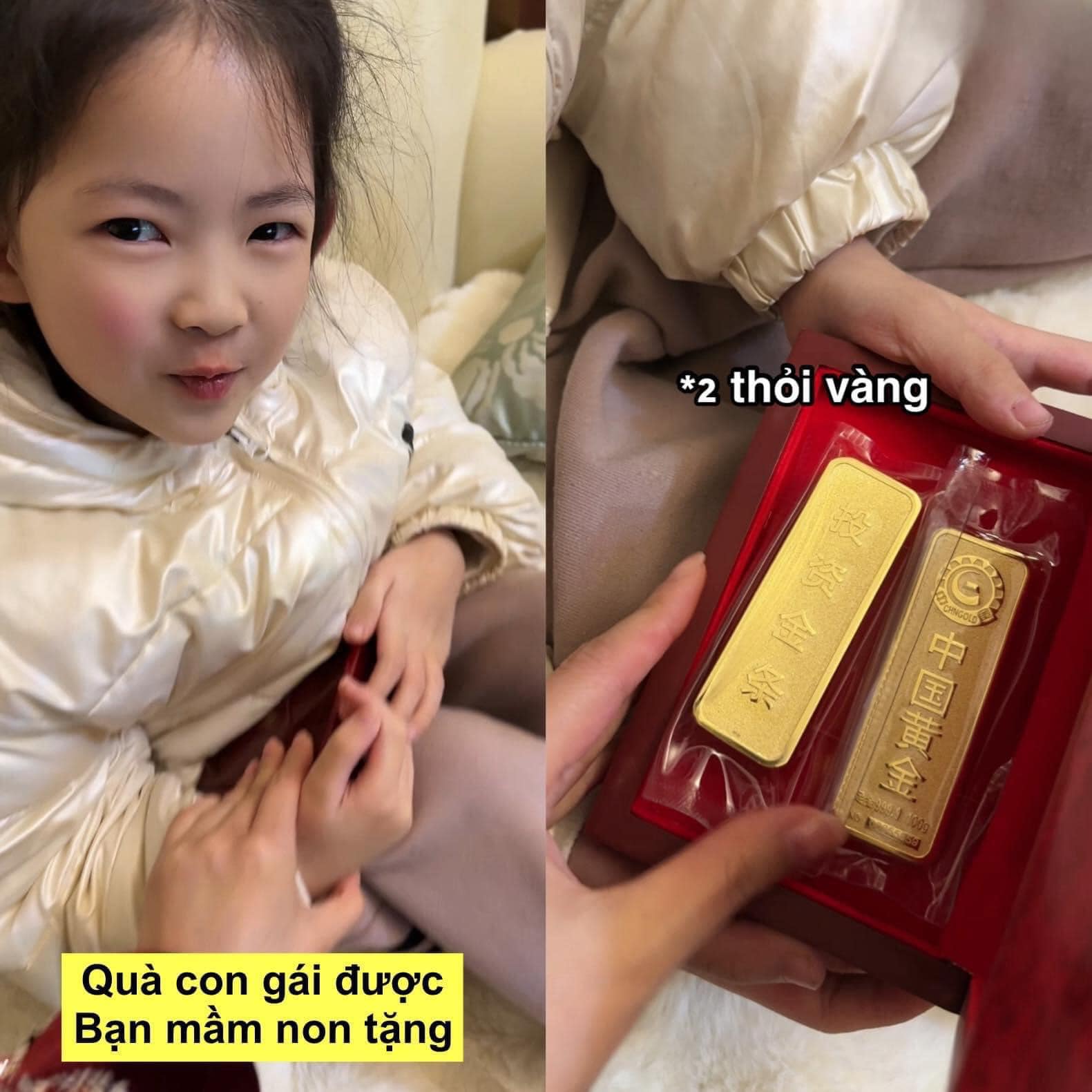 Mẹ bé gái trong đoạn clip đã chia sẻ: "Con bé nhà tôi học mẫu giáo, nay nó cầm về một chiếc hộp gỗ nhìn rất sang trọng, tôi gặng hỏi mãi nó bảo đây là do một bạn mam trong lớp tặng. Mở ra xem thấy trong đó có “là hai thỏi vàng, 2 thỏi 100g” trời ơi.